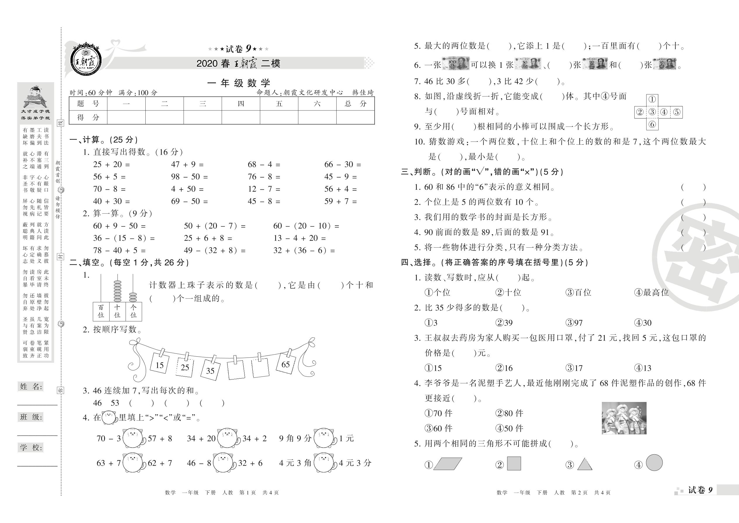 王朝霞期末模拟卷一年级下册数学(人教版)_R210802213356【9】