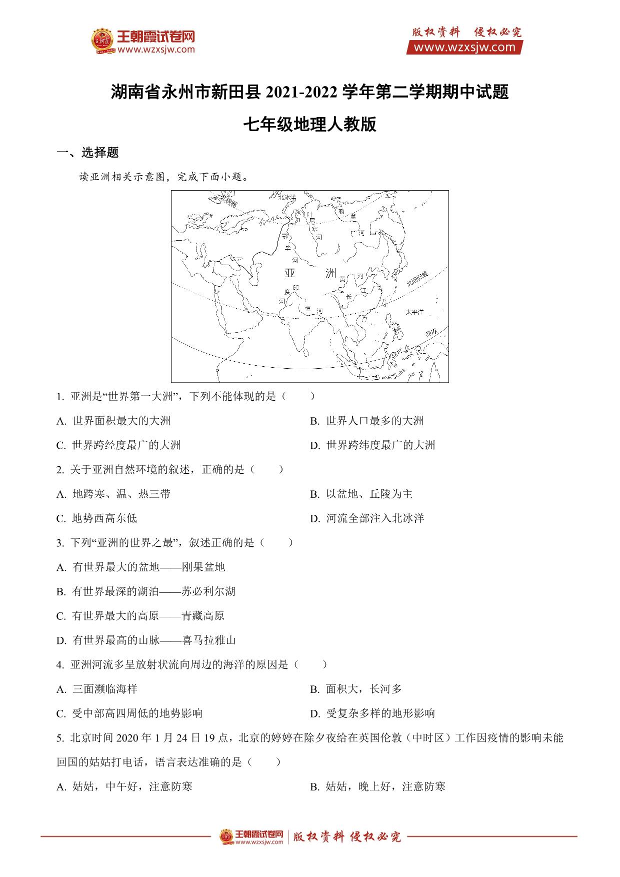湖南省永州市新田县2021-2022学年第二学期期中试题七年级地理(人教版)