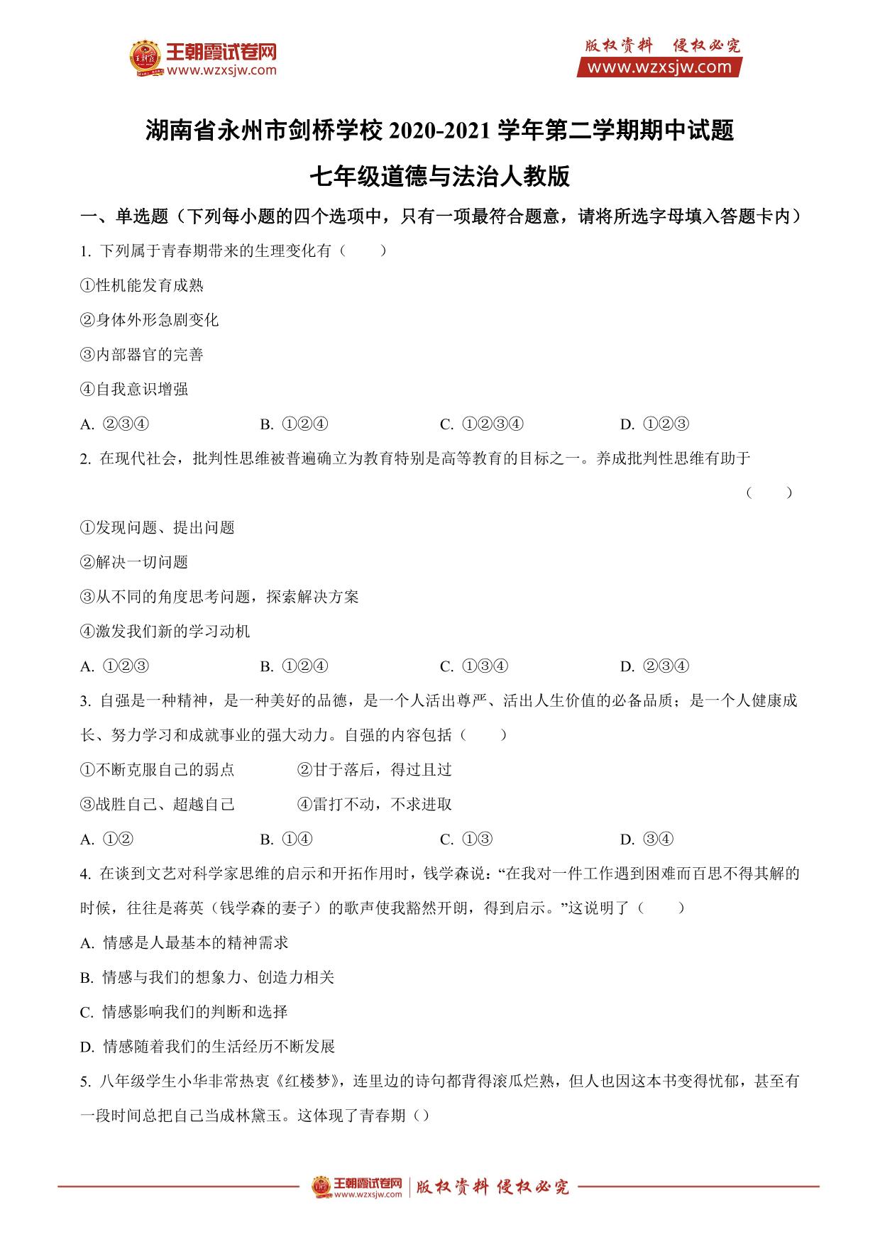 湖南省永州市剑桥学校2020-2021学年第二学期期中试题七年级道德与法治(人教版)