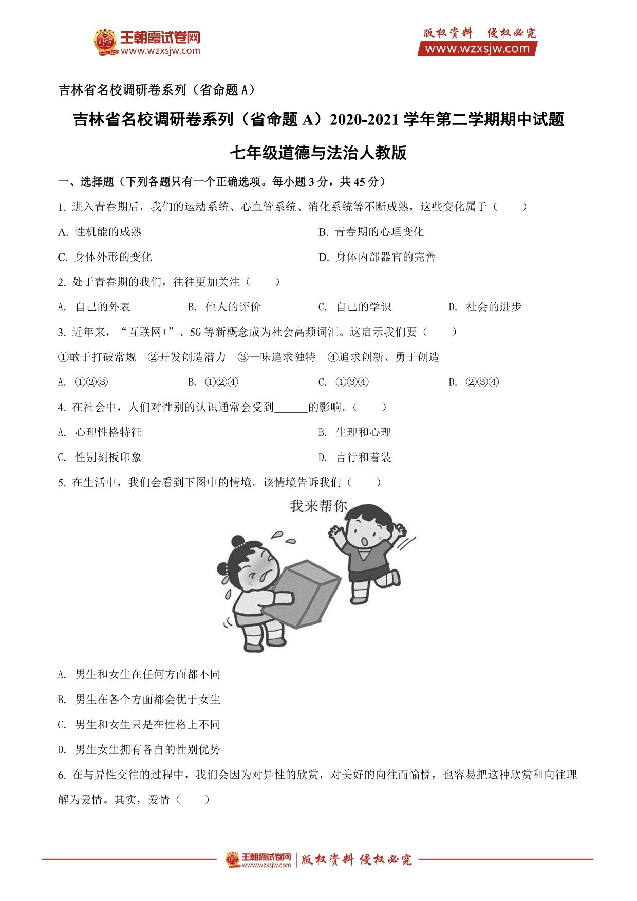 吉林省名校调研卷系列(省命题A)2020-2021学年第二学期期中试题七年级道德与法治(人教版)