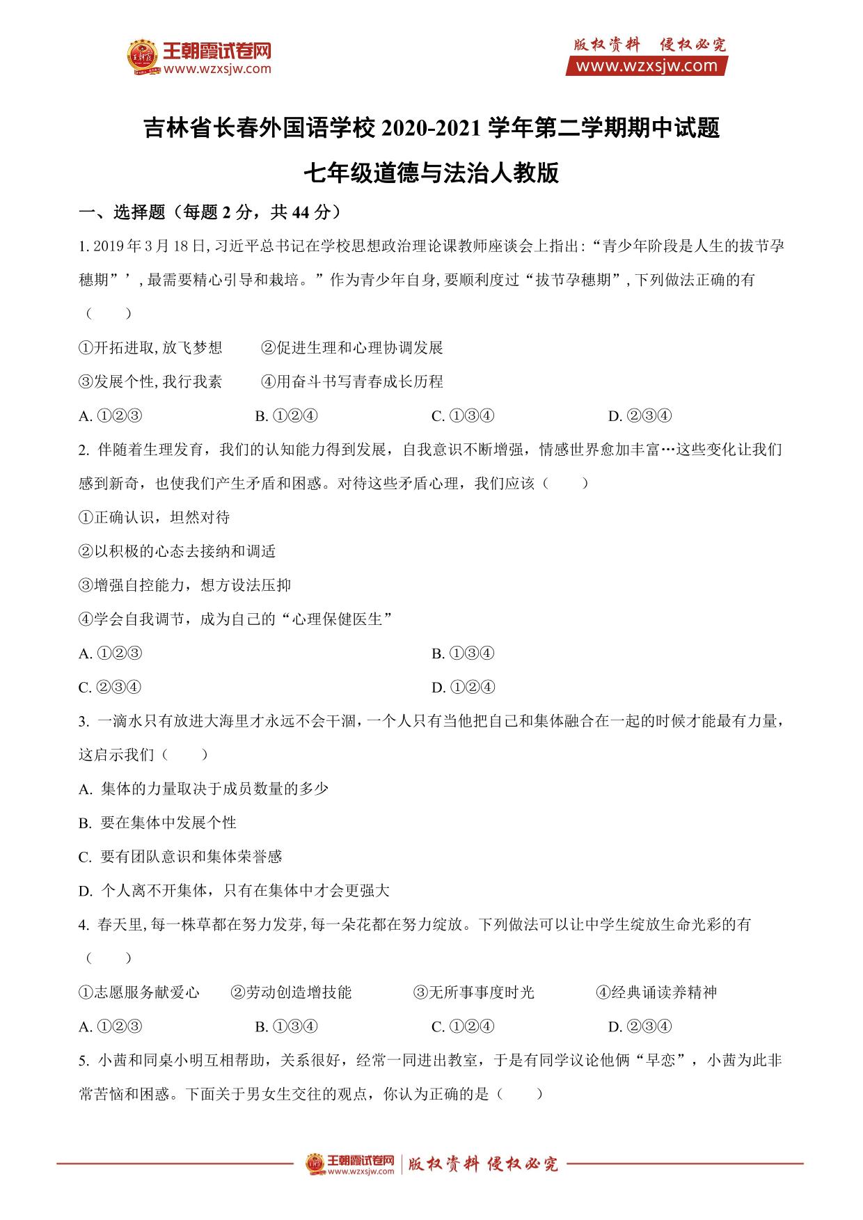 吉林省长春外国语学校2020-2021学年第二学期期中试题七年级道德与法治(人教版)