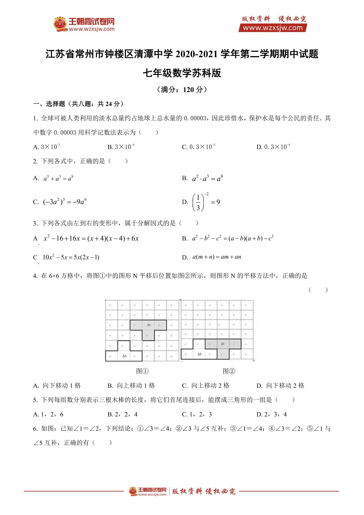 江苏省常州市钟楼区清潭中学2020-2021学年第二学期期中试题七年级数学(苏科版)