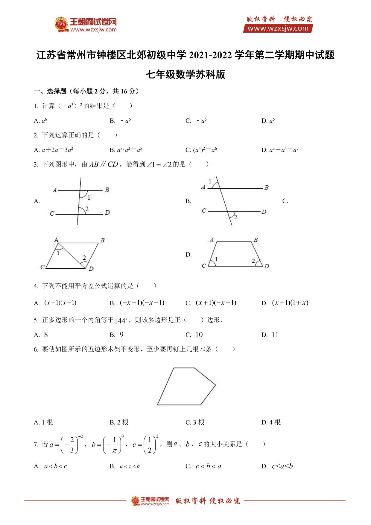 江苏省常州市钟楼区北郊初级中学2021-2022学年第二学期期中试题七年级数学(苏科版)