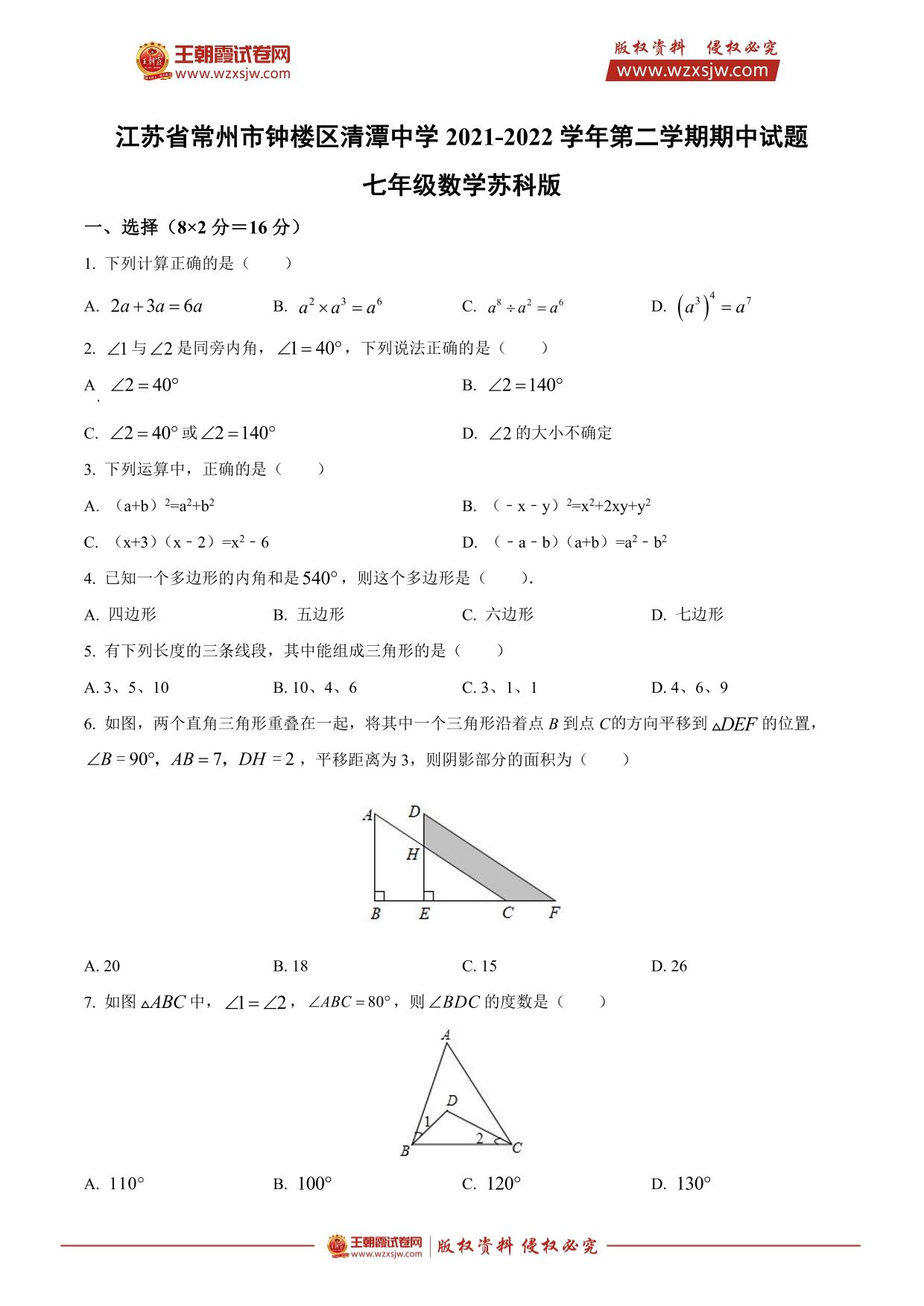 江苏省常州市钟楼区清潭中学2021-2022学年第二学期期中试题七年级数学(苏科版)