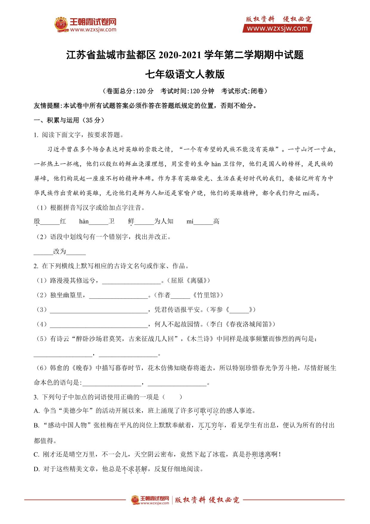 江苏省盐城市盐都区2020-2021学年第二学期期中试题七年级语文(人教版)