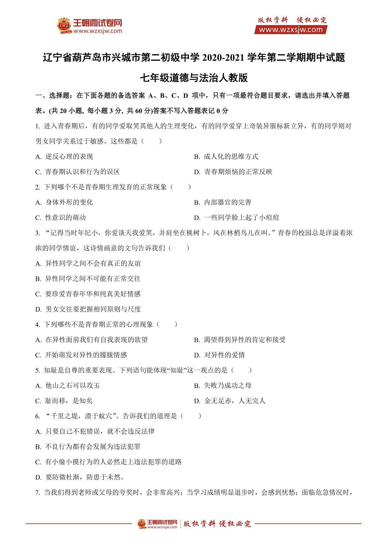 辽宁省葫芦岛市兴城市第二初级中学2020-2021学年第二学期期中试题七年级道德与法治(人教版)