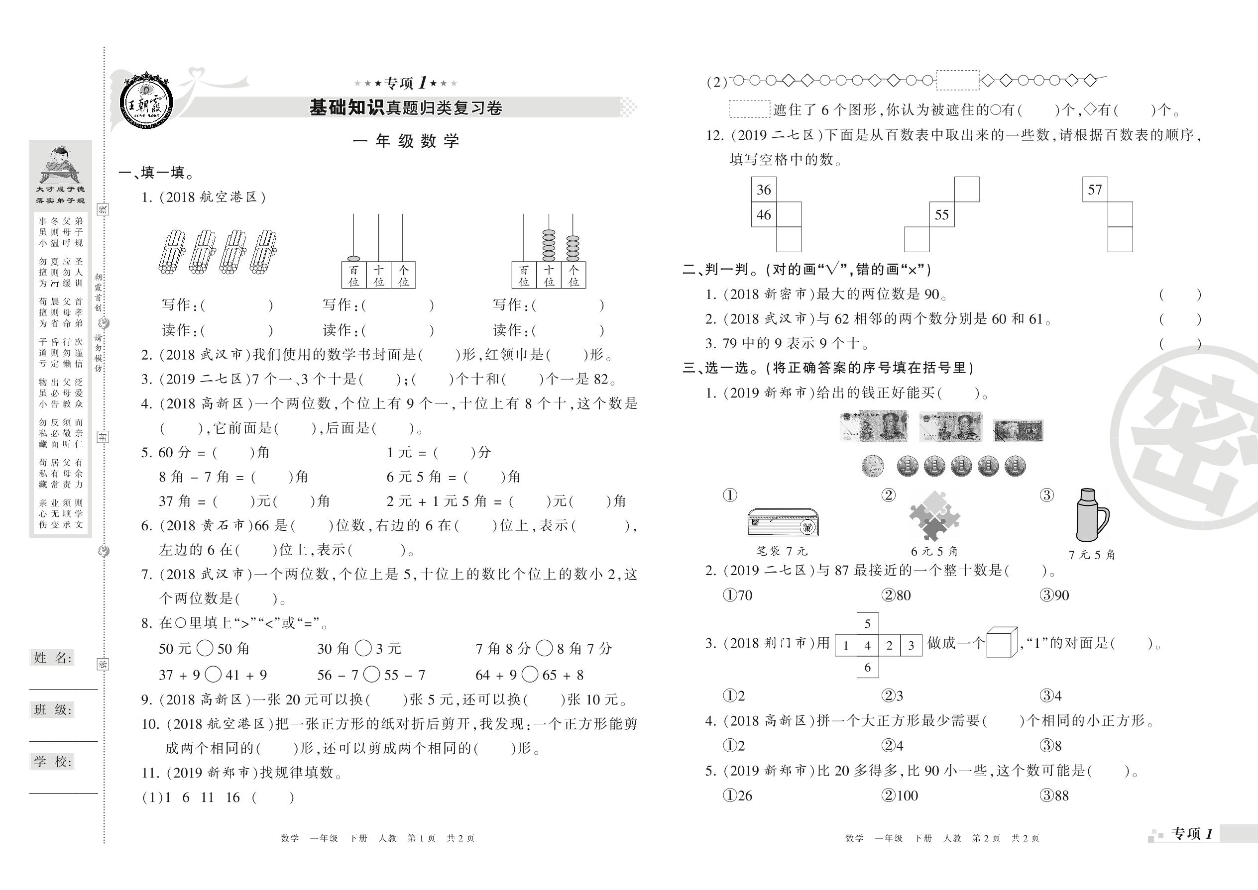 王朝霞期末专项卷——基础知识、计算真题归类复习卷一年级下册数学(人教版)_R210802213407【0】