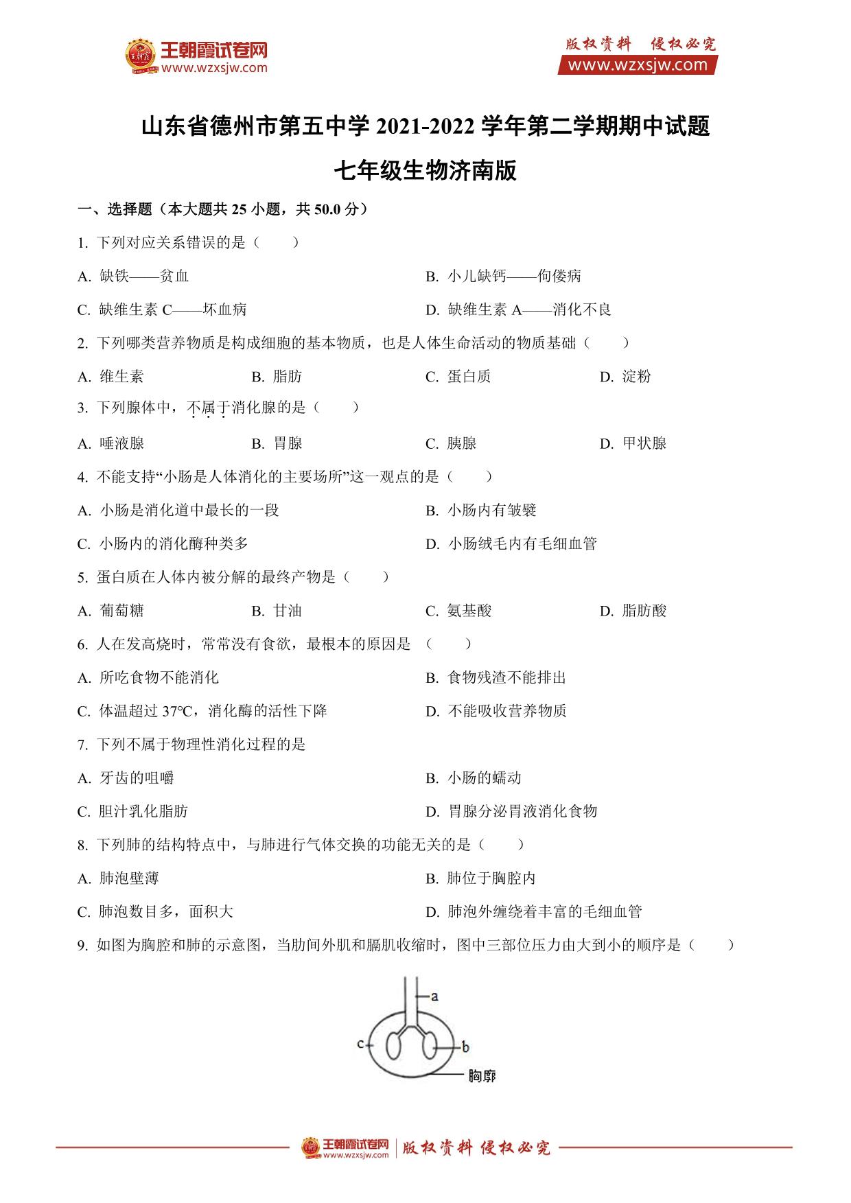 山东省德州市第五中学2021-2022学年第二学期期中试题七年级生物(济南版)