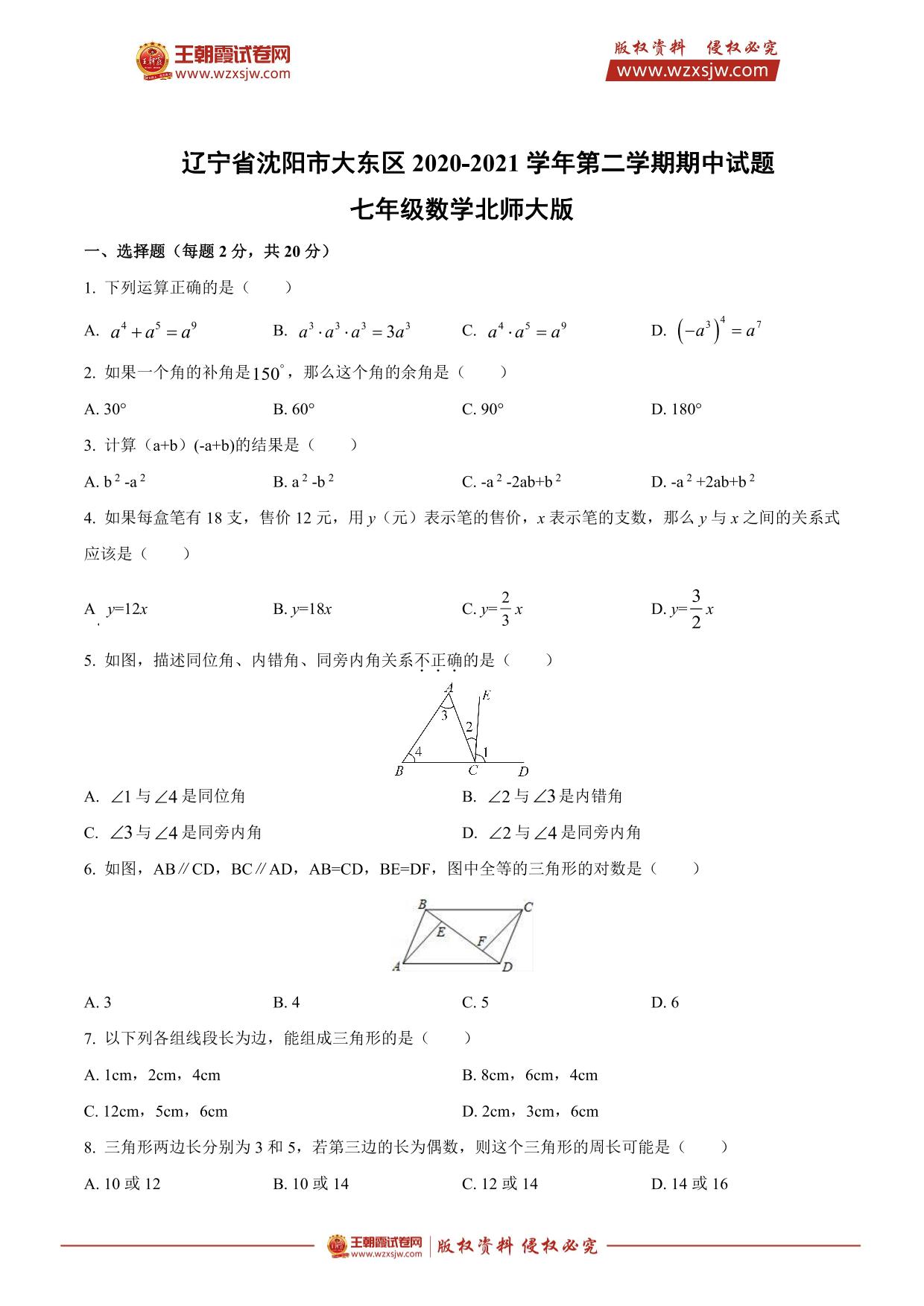 辽宁省沈阳市大东区2020-2021学年第二学期期中试题七年级数学(北师版)
