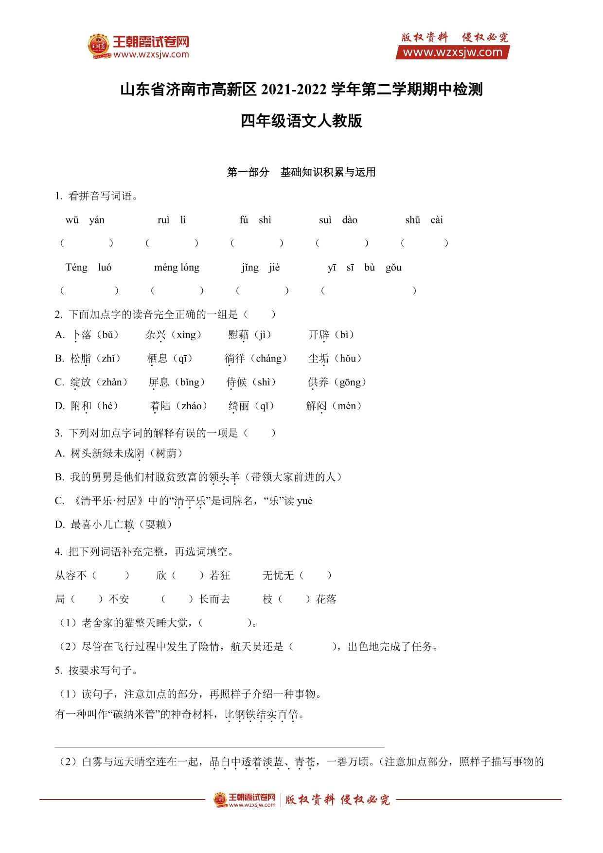 山东省济南市高新区2021-2022学年第二学期期中检测四年级语文(人教版)