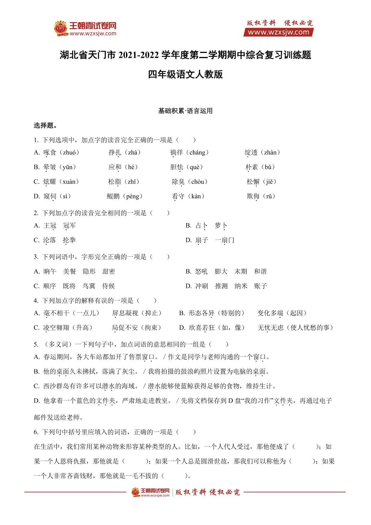 湖北省天门市2021-2022学年度第二学期期中综合复习训练题四年级语文(人教版)