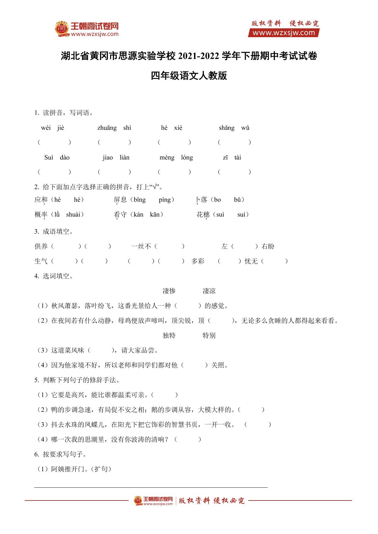 湖北省黄冈市思源实验学校2021-2022学年下册期中考试试卷四年级语文(人教版)