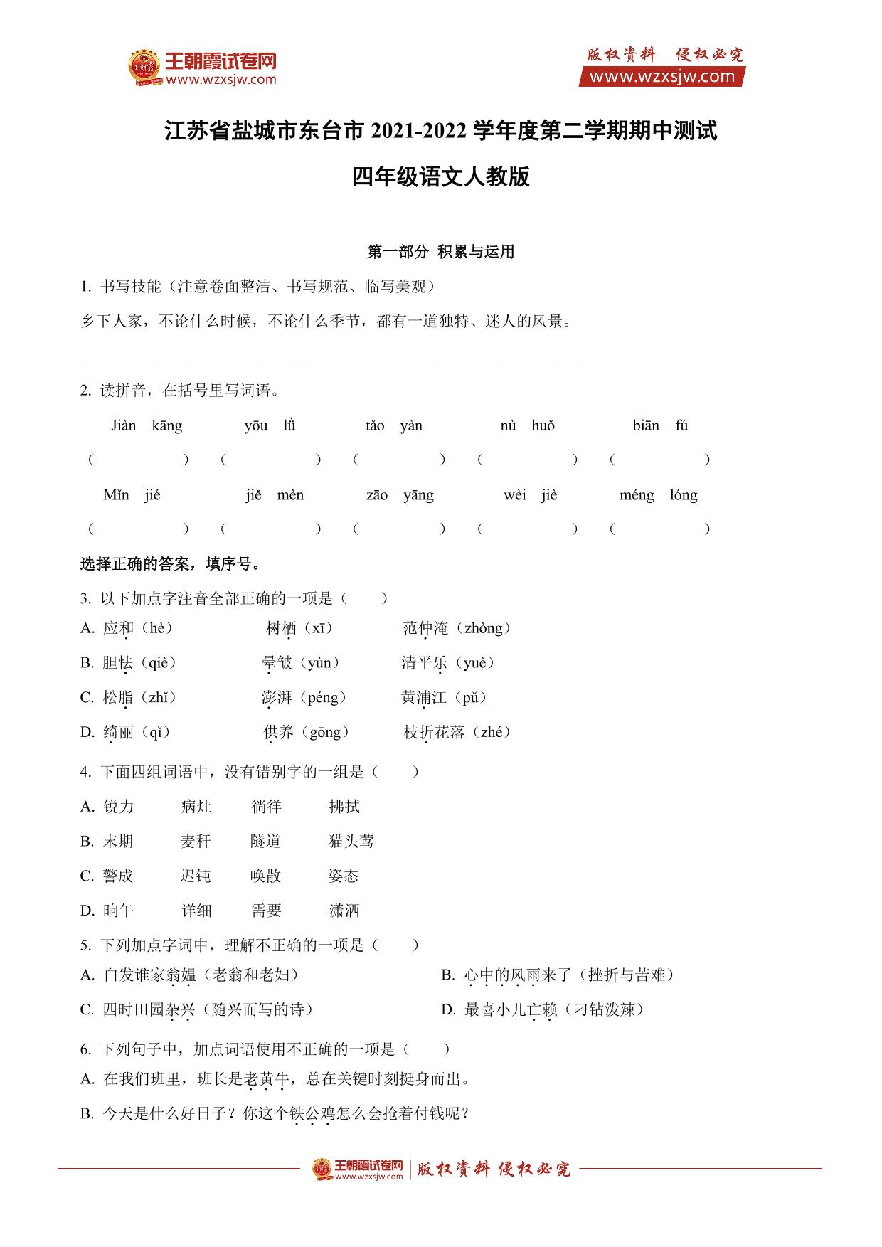 江苏省盐城市东台市2021-2022学年度第二学期期中测试四年级语文(人教版)