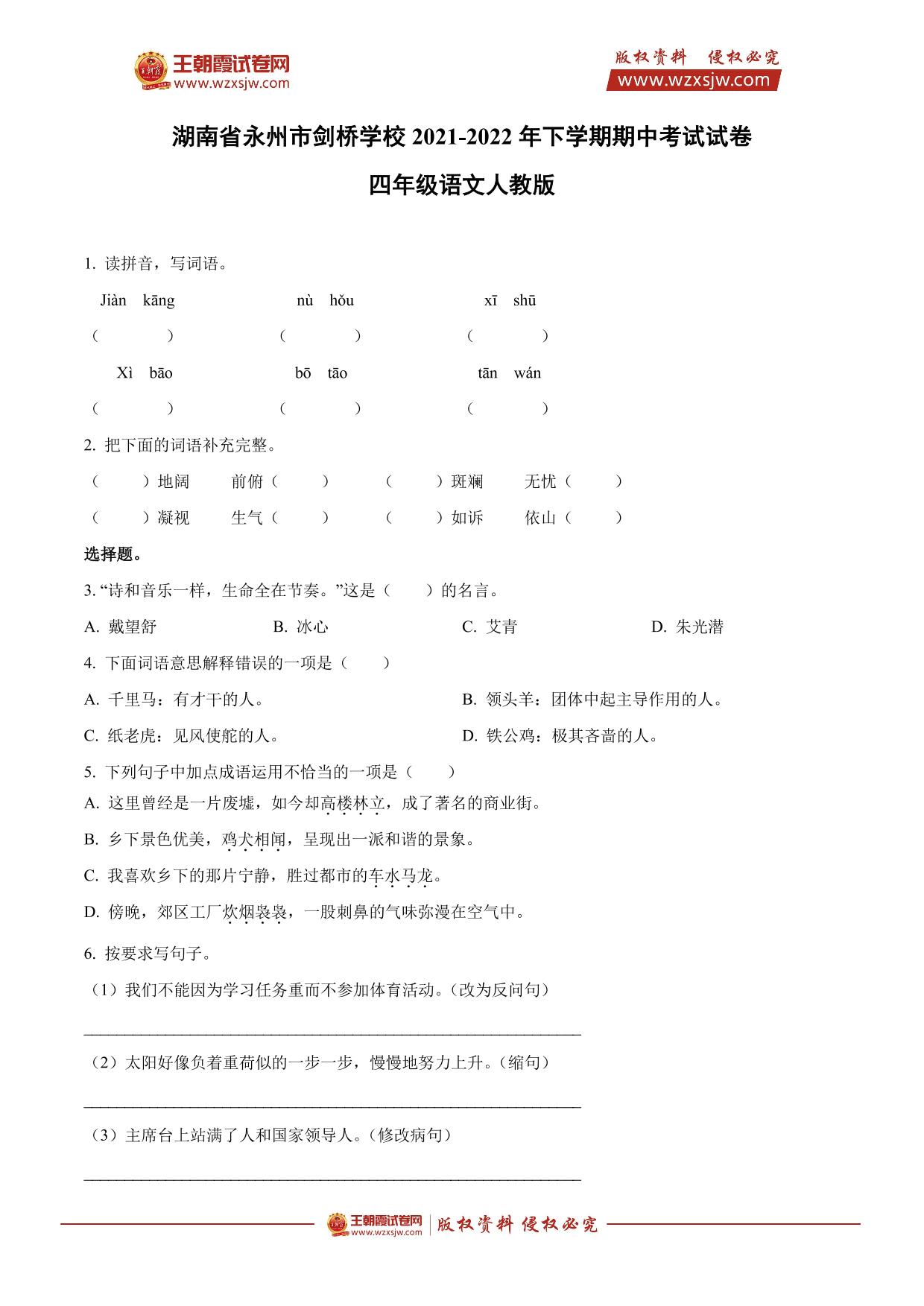 湖南省永州市剑桥学校2021-2022年下学期期中考试试卷四年级语文(人教版)
