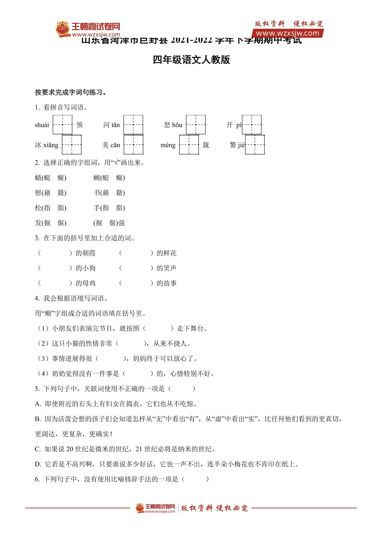 山东省菏泽市巨野县2021-2022学年下学期期中考试四年级语文(人教版)