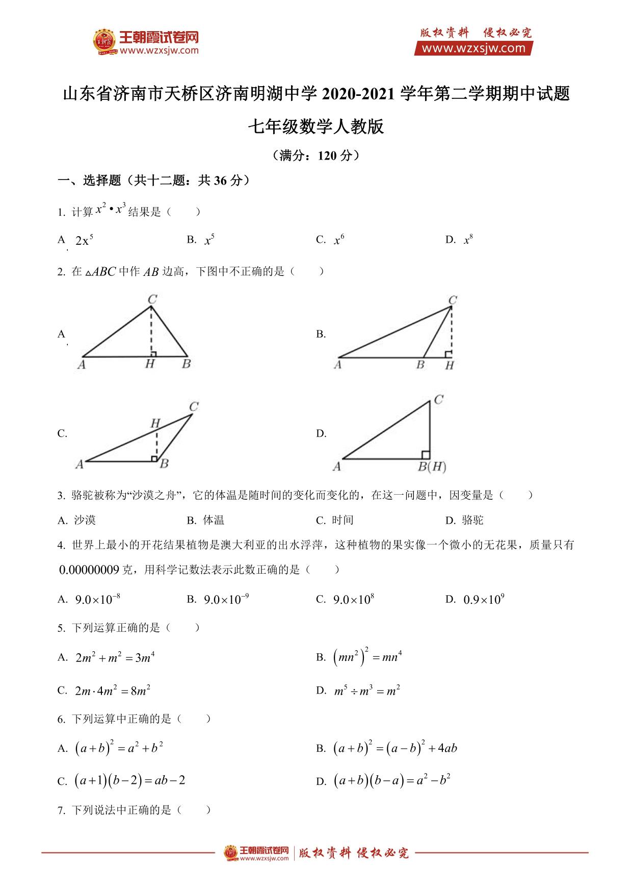 山东省济南市天桥区济南明湖中学2020-2021学年第二学期期中试题七年级数学(人教版)