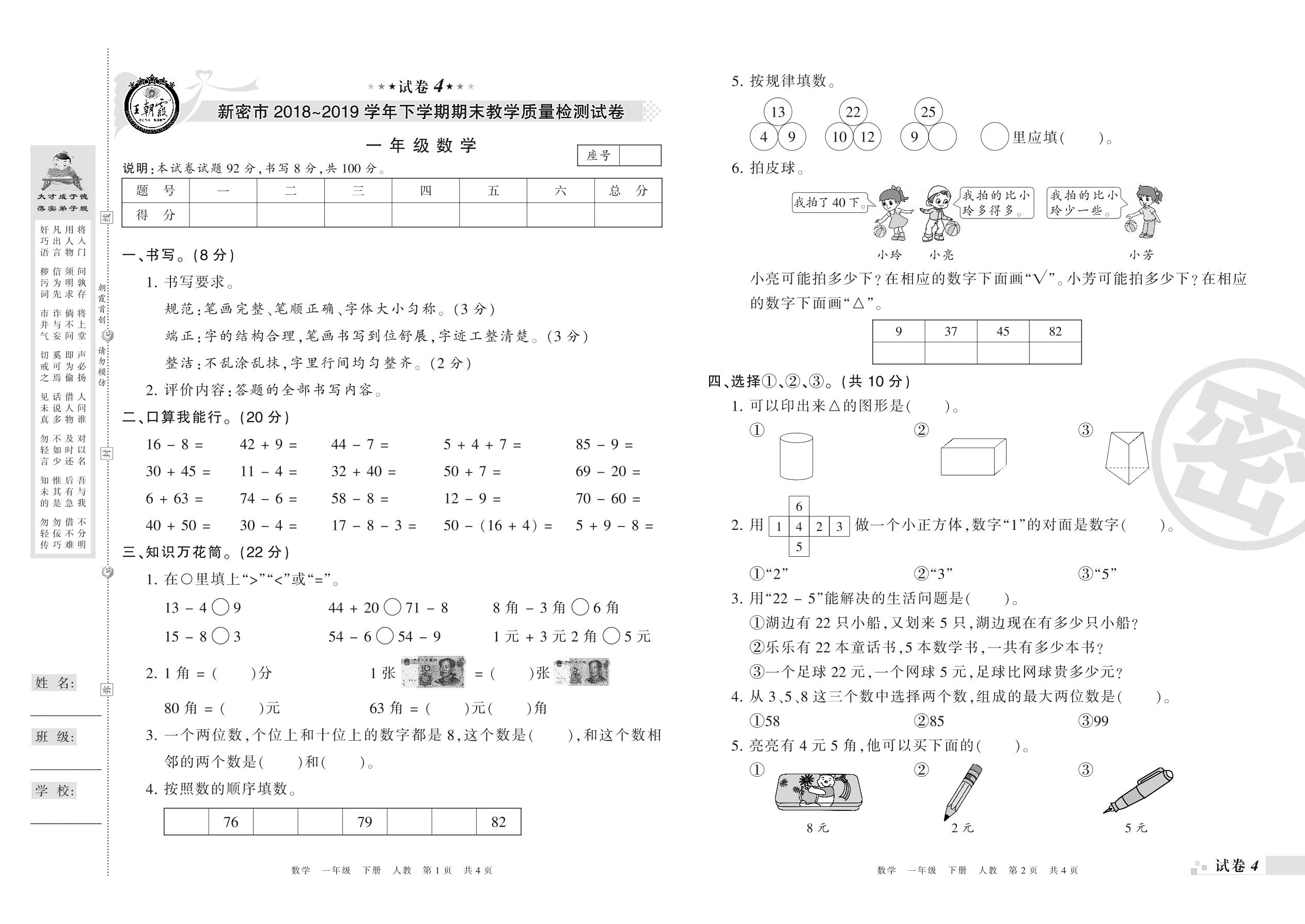 2018-2019学年第二学期新密市一年级数学试卷(人教版)【4】