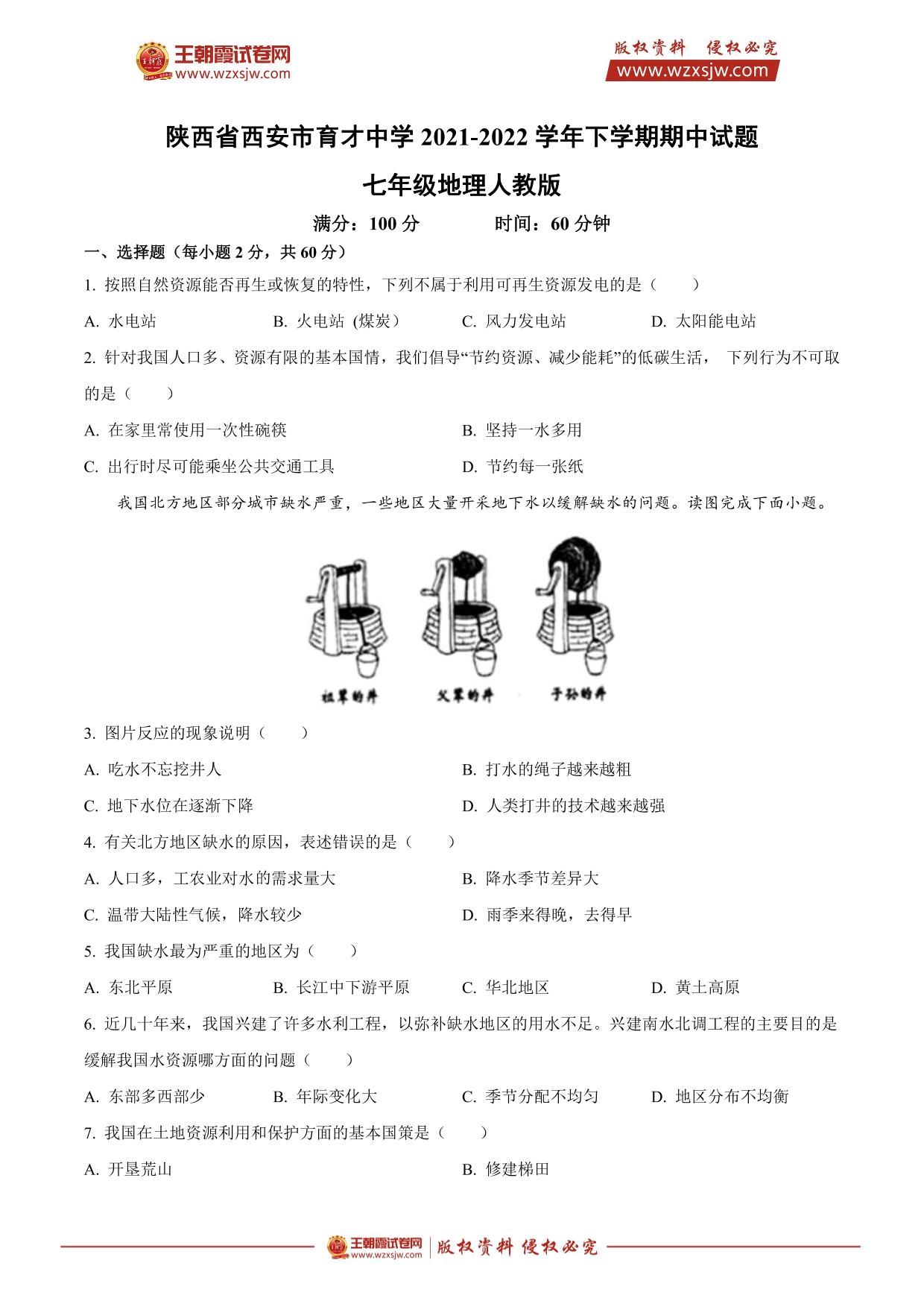 陕西省西安市育才中学2021-2022学年下学期期中试题七年级地理(人教版)