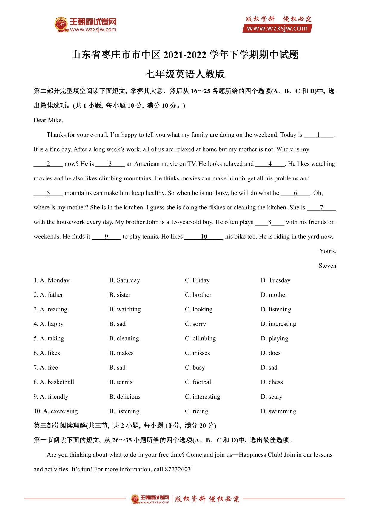 山东省枣庄市市中区2021-2022学年下学期期中试题七年级英语(人教版)【无听力音频】