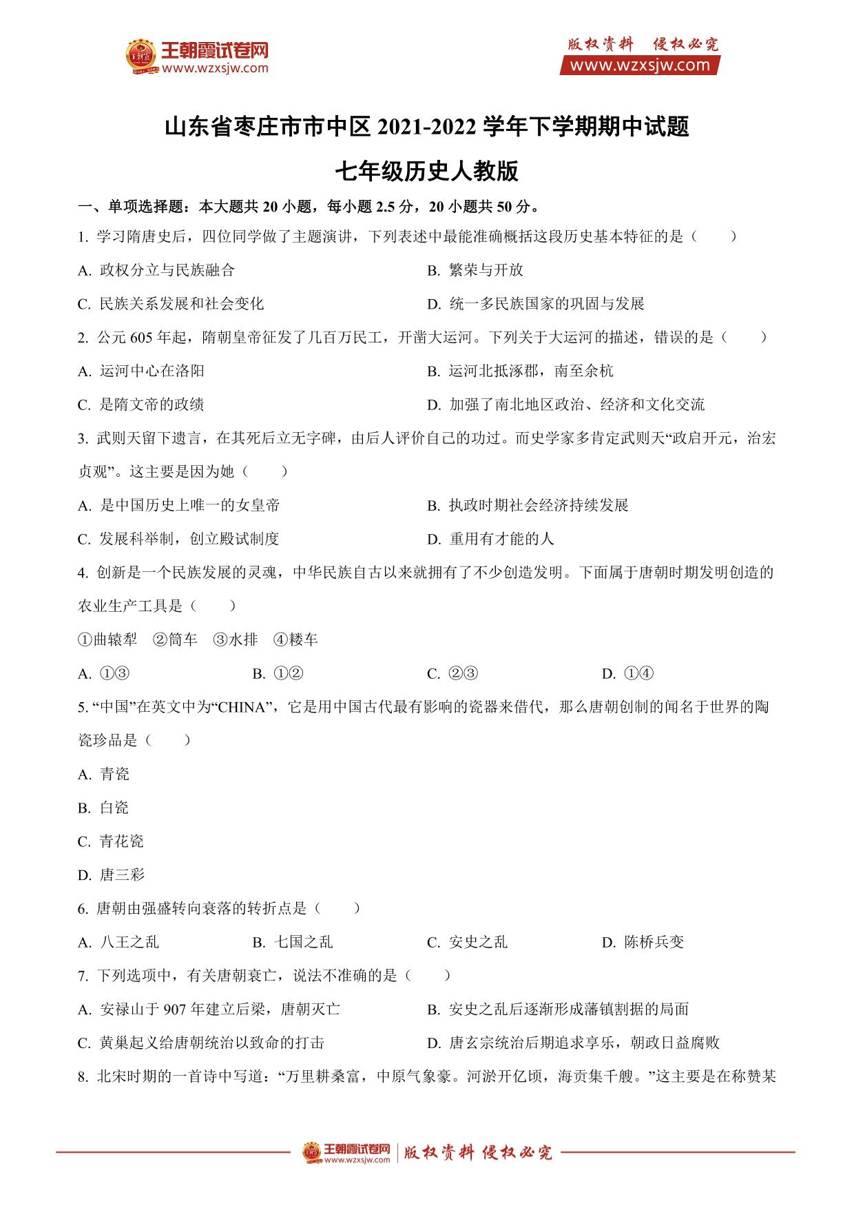 山东省枣庄市市中区2021-2022学年下学期期中试题七年级历史(人教版)
