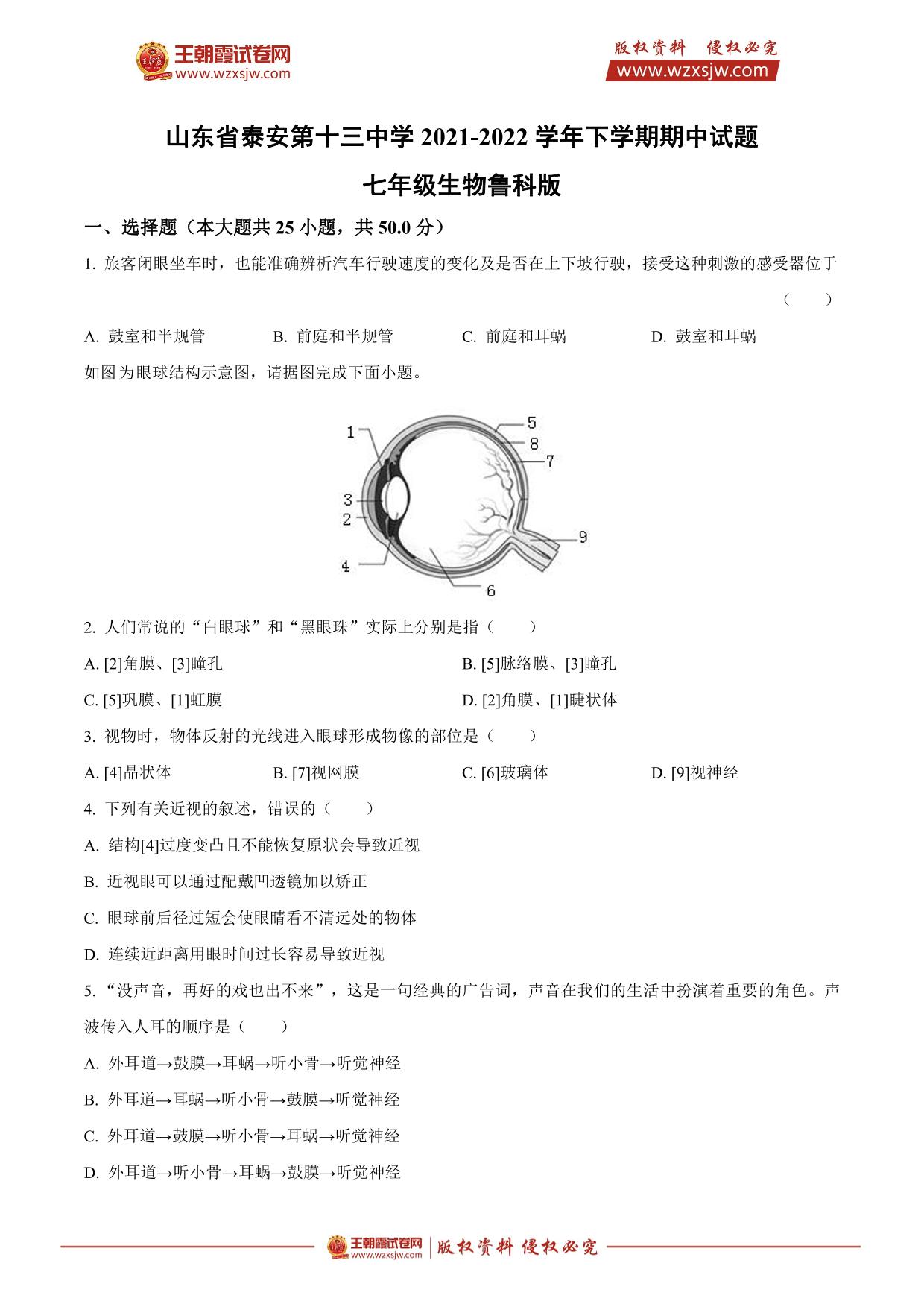 山东省泰安第十三中学2021-2022学年下学期期中试题七年级生物(鲁科版)五四学制