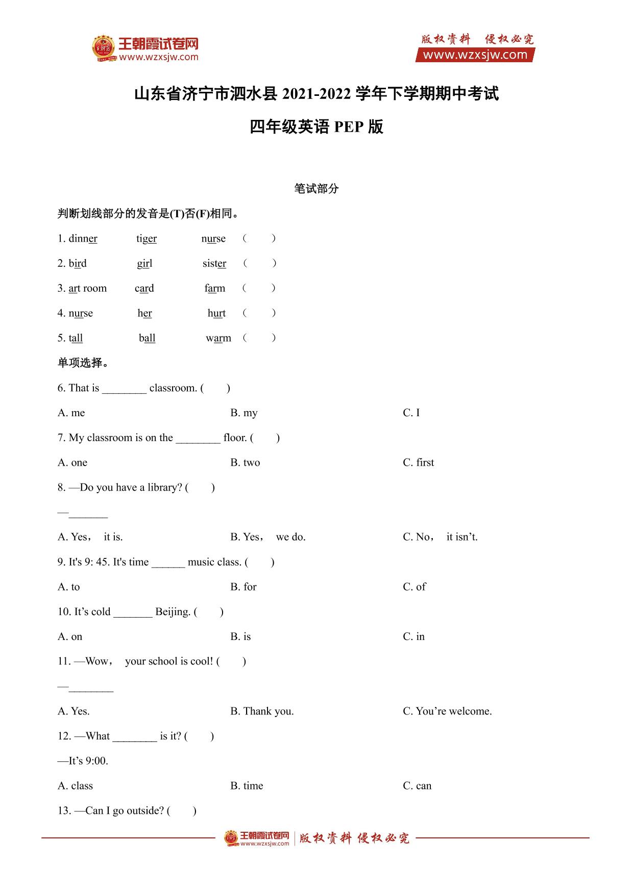 山东省济宁市泗水县2021-2022学年下学期期中考试四年级英语(PEP版)【无听力音频】