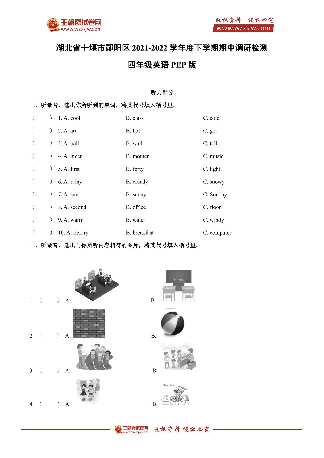 湖北省十堰市郧阳区2021-2022学年度下学期期中调研检测四年级英语(PEP版)【无听力音频】