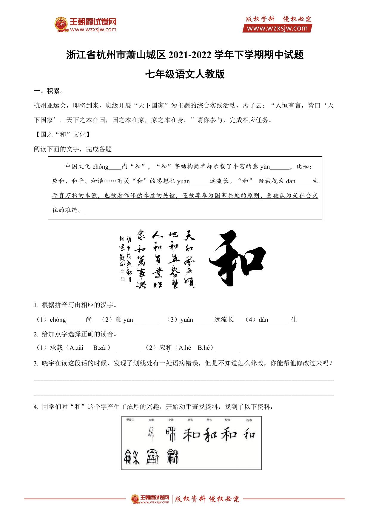浙江省杭州市萧山城区2021-2022学年下学期期中试题七年级语文(人教版)