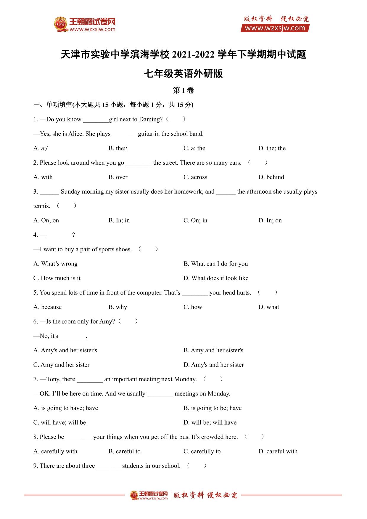 天津市实验中学滨海学校2021-2022学年下学期期中试题七年级英语(外研版)【无听力音频】