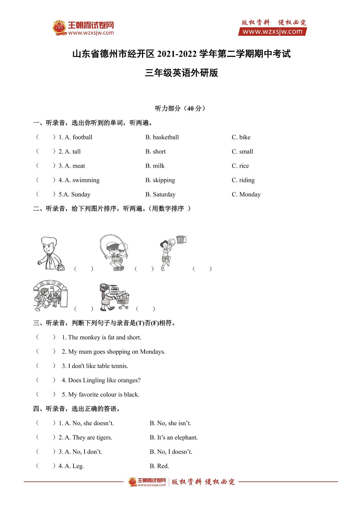 山东省德州市经开区2021-2022学年第二学期期中考试三年级英语(外研版)【无听力音频】