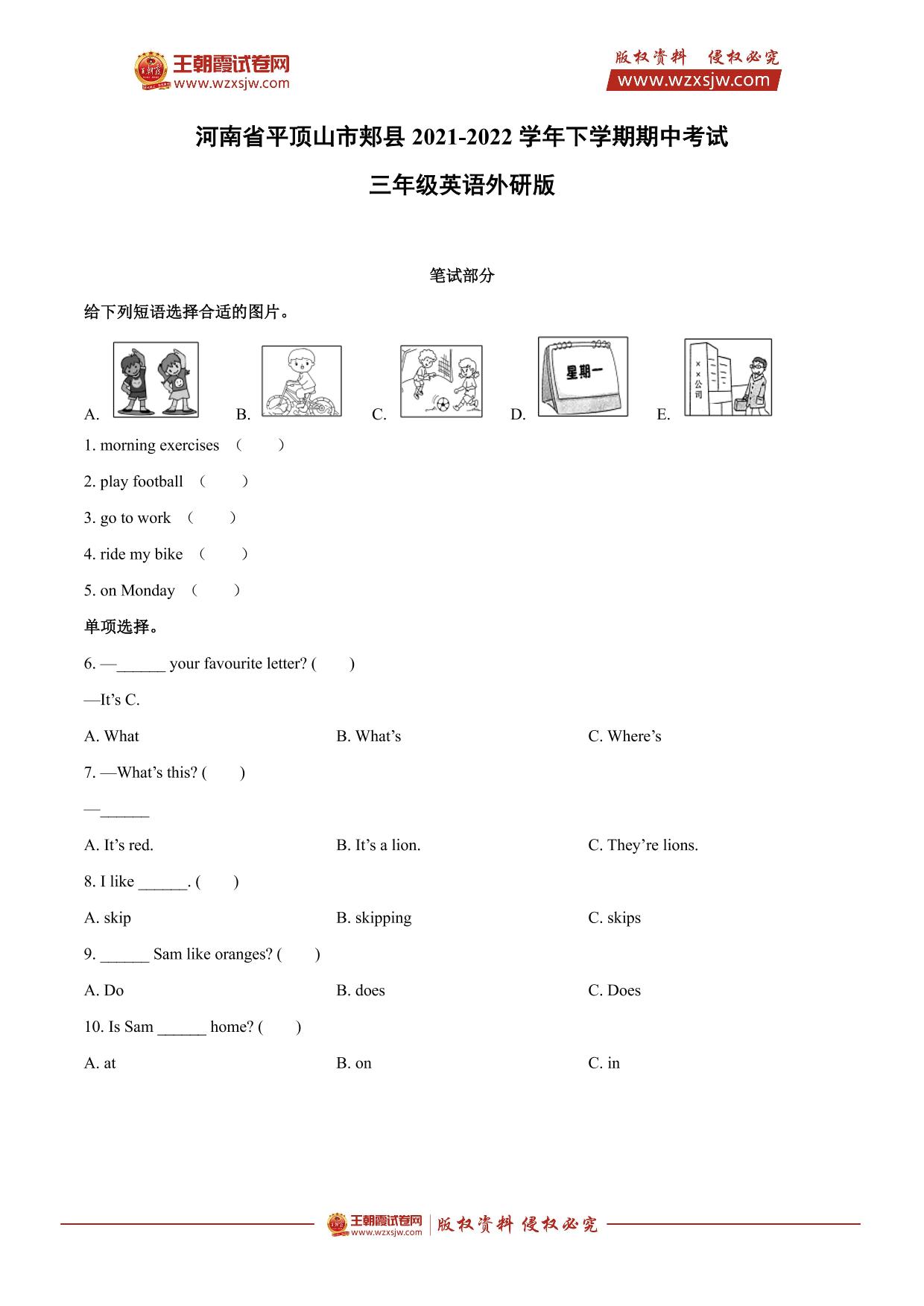 河南省平顶山市郏县2021-2022学年下学期期中考试三年级英语(外研版)【无听力音频】