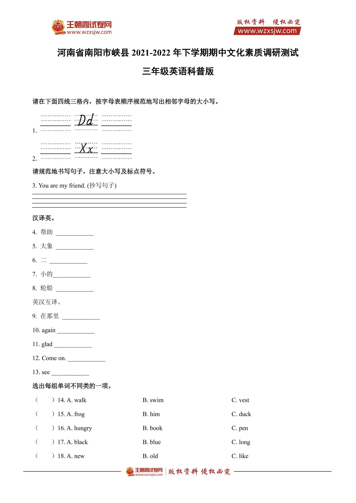 河南省南阳市西峡县2021-2022学年下学期期中文化素质调研测试三年级英语(科普版)【无听力音频】