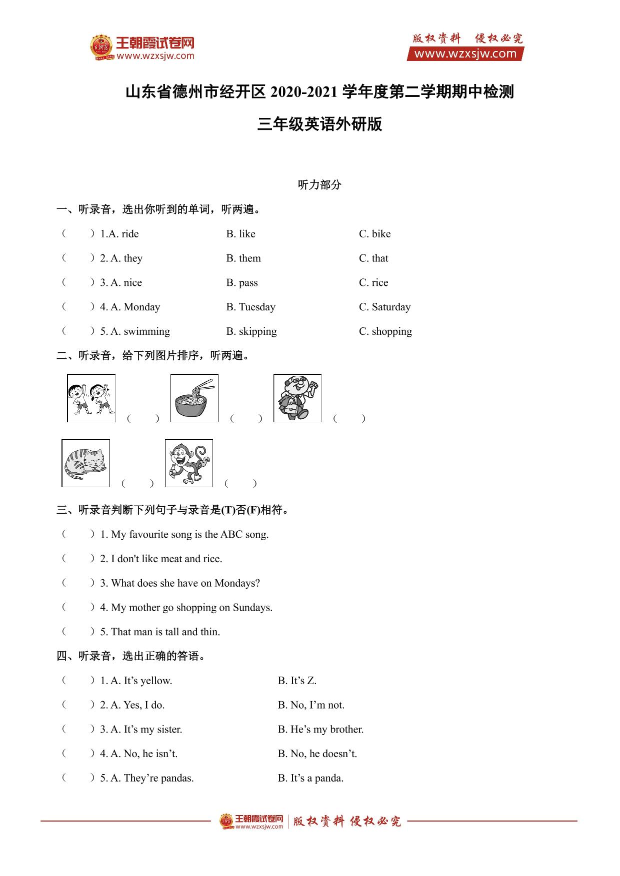 山东省德州市经开区2020-2021学年度第二学期期中检测三年级英语(外研版)【无听力音频】