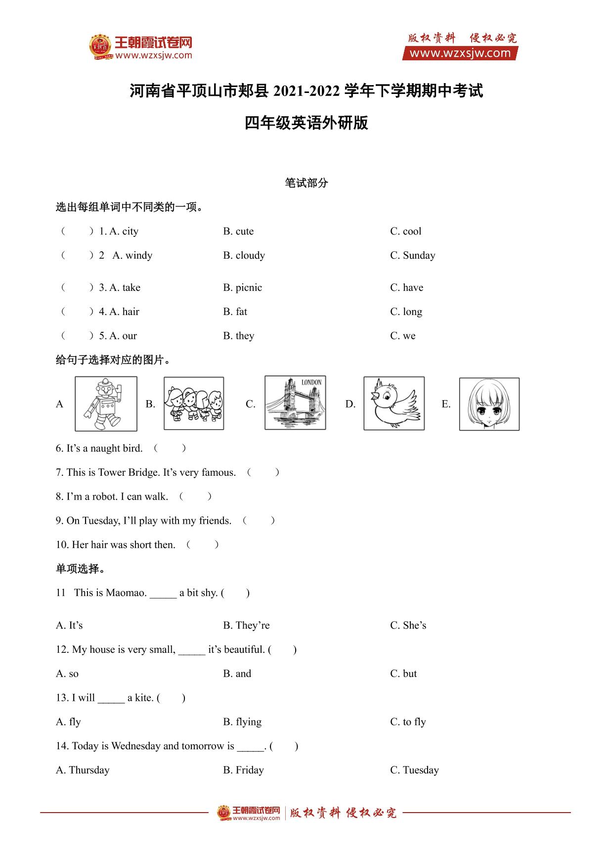河南省平顶山市郏县2021-2022学年下学期期中考试四年级英语(外研版)【无听力音频】