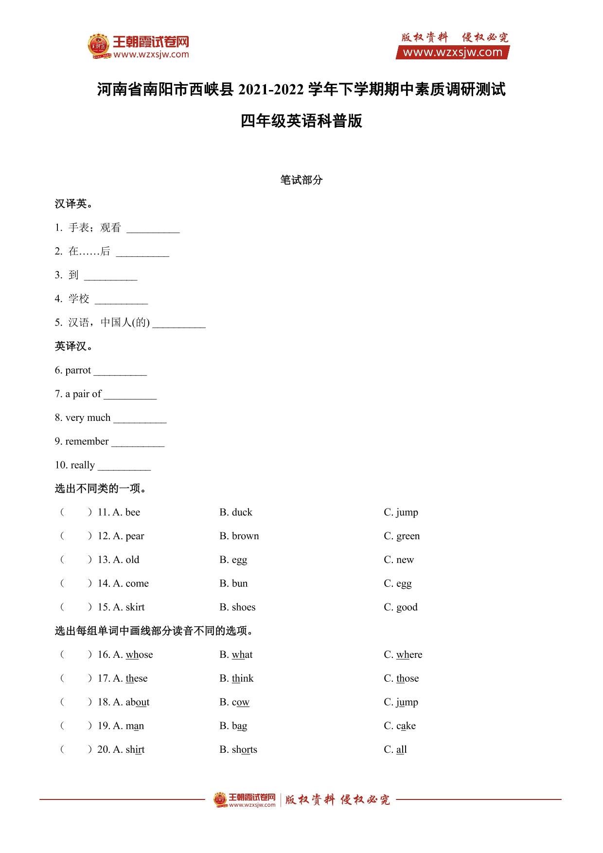 河南省南阳市西峡县2021-2022学年下学期期中素质调研测试四年级英语(科普版)【无听力音频】