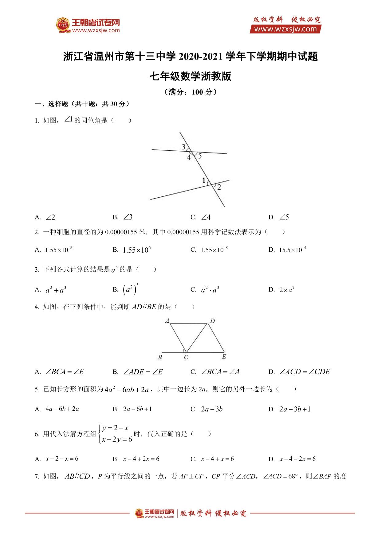 浙江省温州市第十三中学2020-2021学年下学期期中试题七年级数学(浙教版)