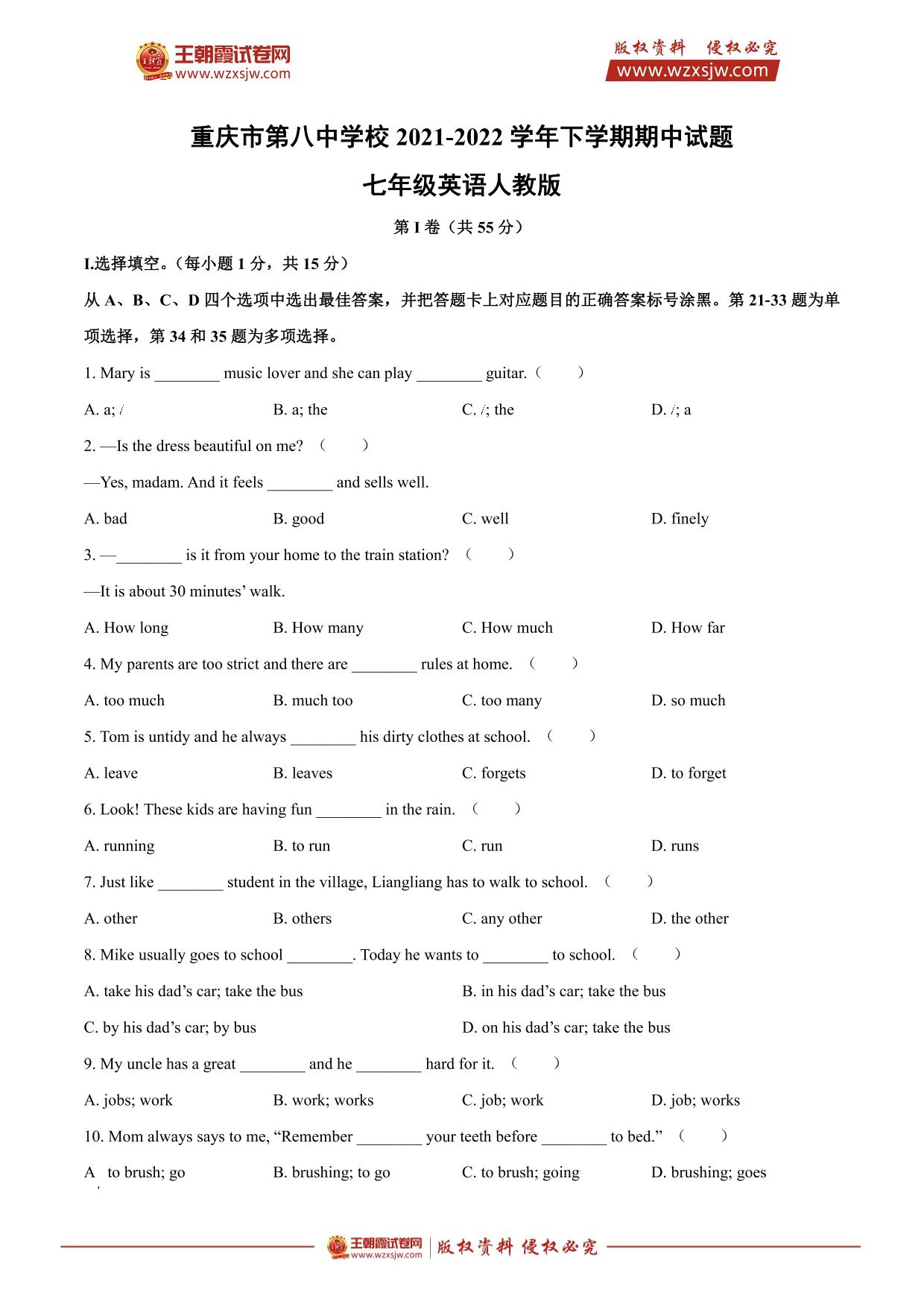 重庆市第八中学校2021-2022学年下学期期中试题七年级英语(人教版)【无听力音频】