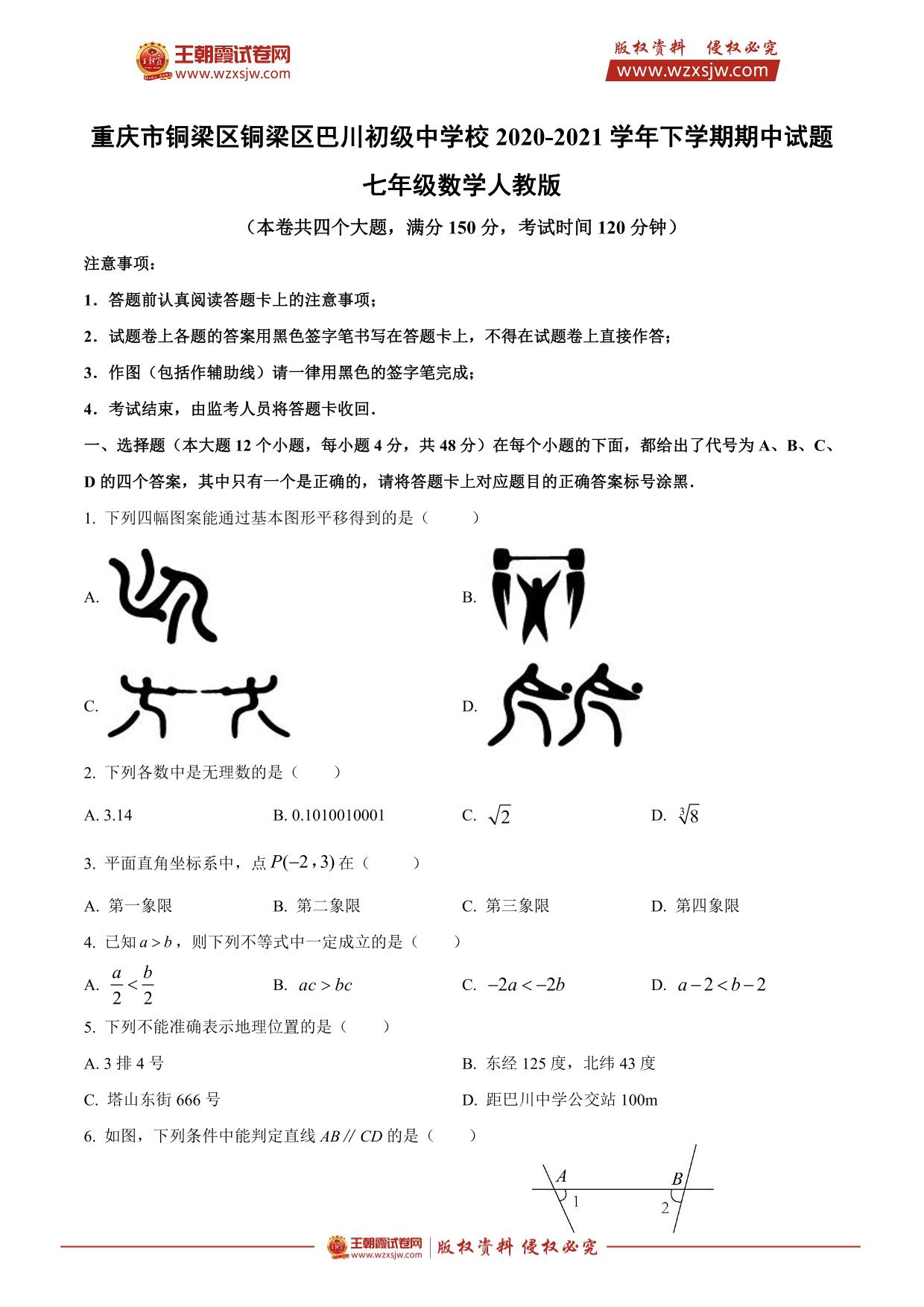 重庆市铜梁区铜梁区巴川初级中学校2020-2021学年下学期期中试题七年级数学(人教版)