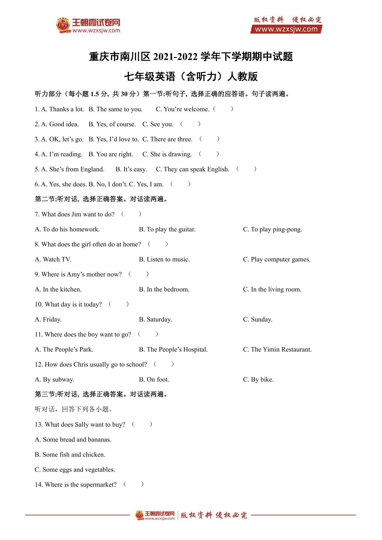 重庆市南川区2021-2022学年下学期期中试题七年级英语(含听力)(人教版)【无听力音频】