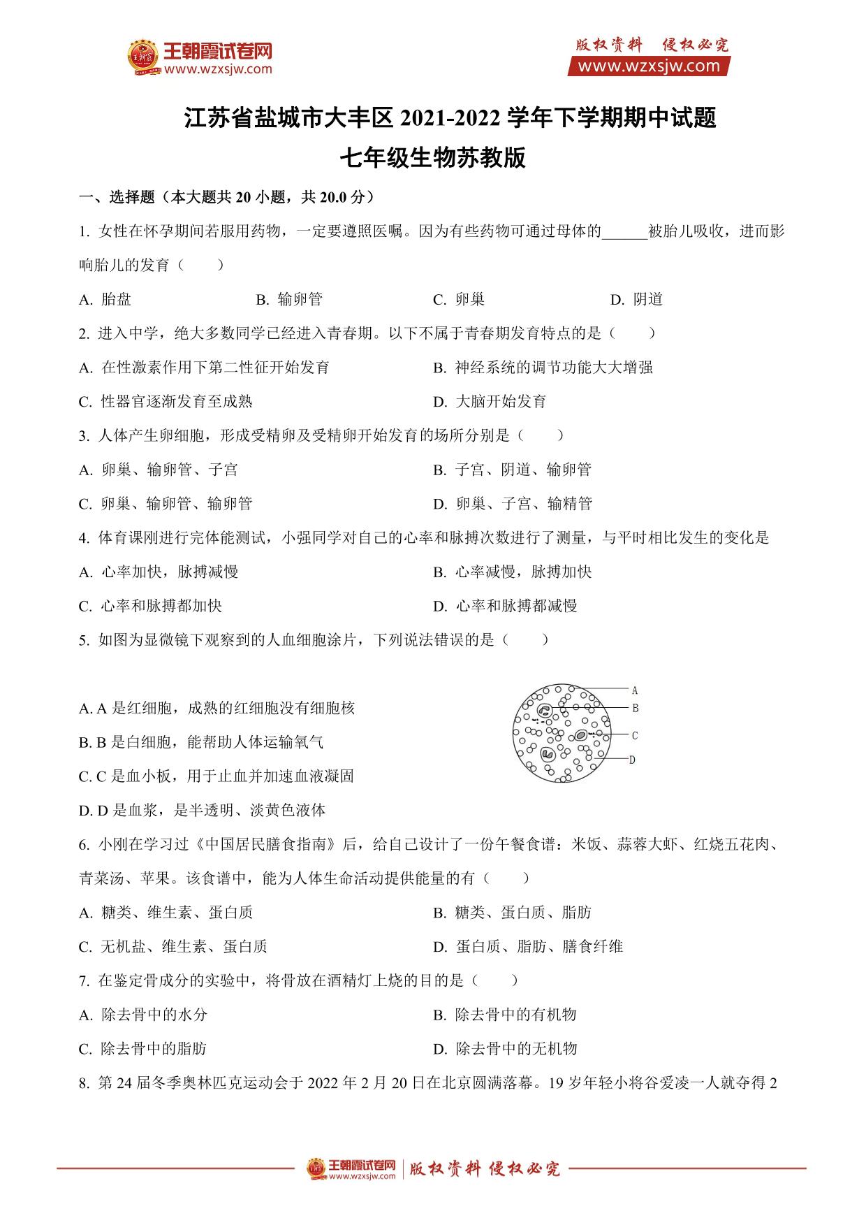江苏省盐城市大丰区2021-2022学年下学期期中试题七年级生物(苏教版)
