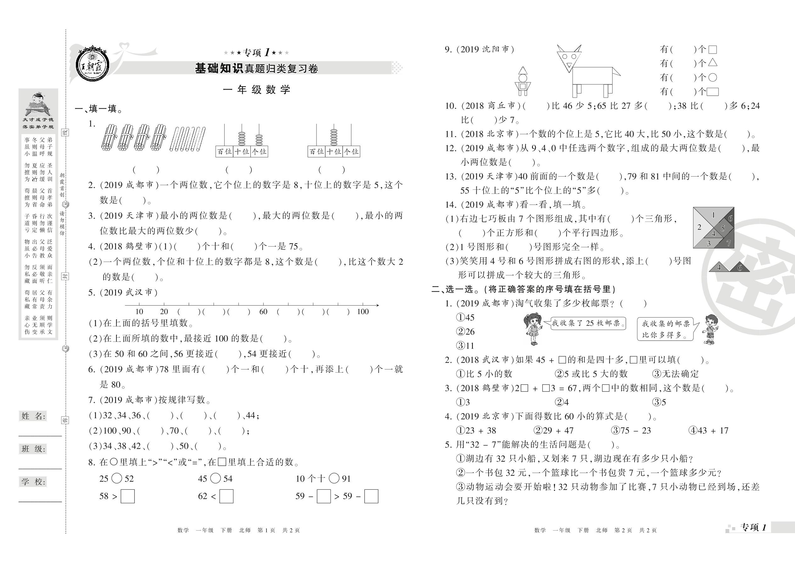 王朝霞期末专项卷——基础知识、计算真题归类复习卷一年级下册数学(北师版)_R210802213457【0】