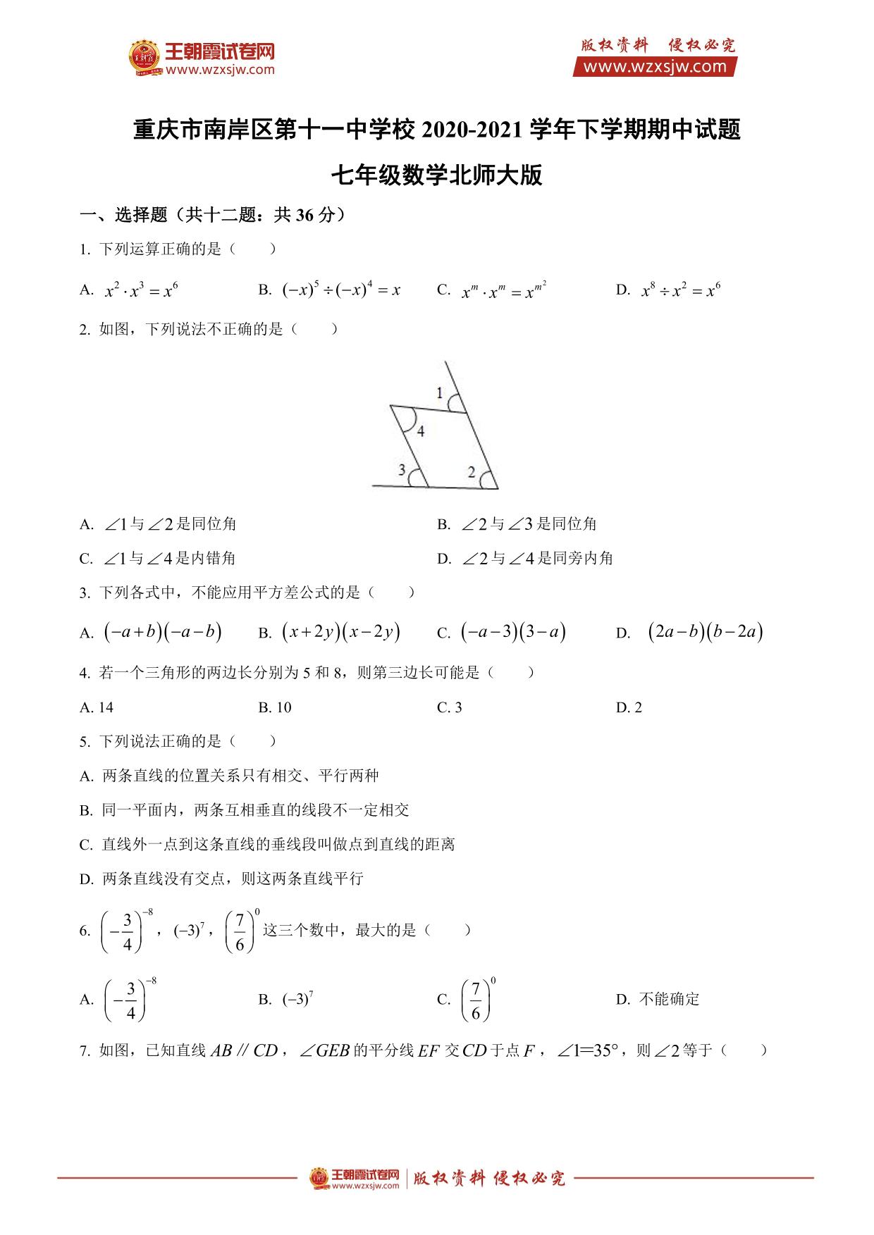 重庆市南岸区第十一中学校2020-2021学年下学期期中试题七年级数学(北师大版)