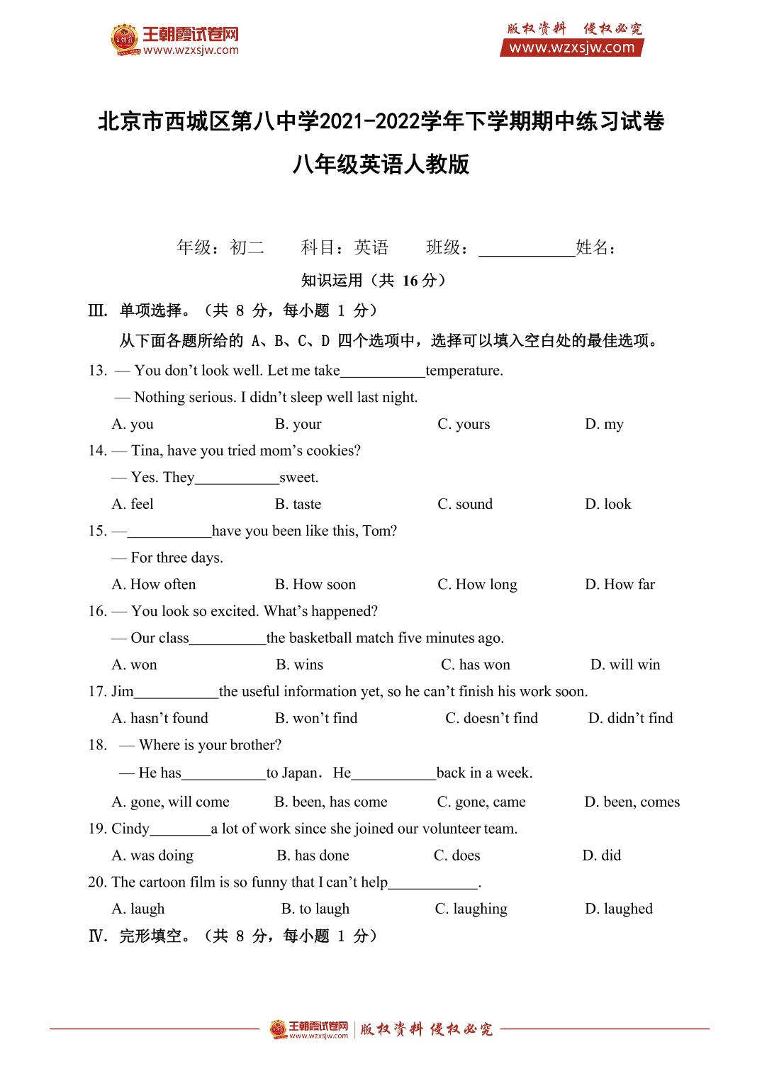 北京市西城区第八中学2021-2022学年下学期期中练习试卷八年级英语(人教版)【无听力音频】
