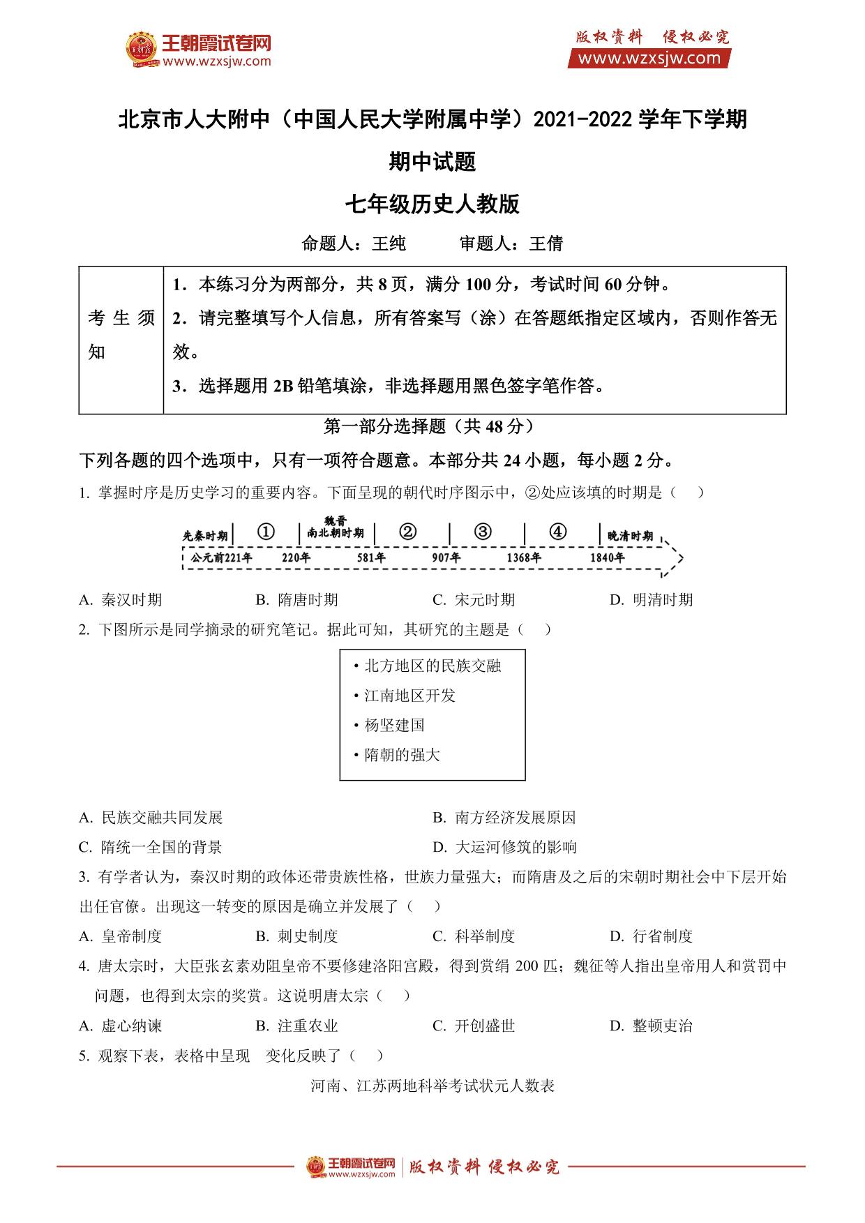 北京市人大附中(中国人民大学附属中学)2021-2022学年下学期期中试题七年级历史(人教版)