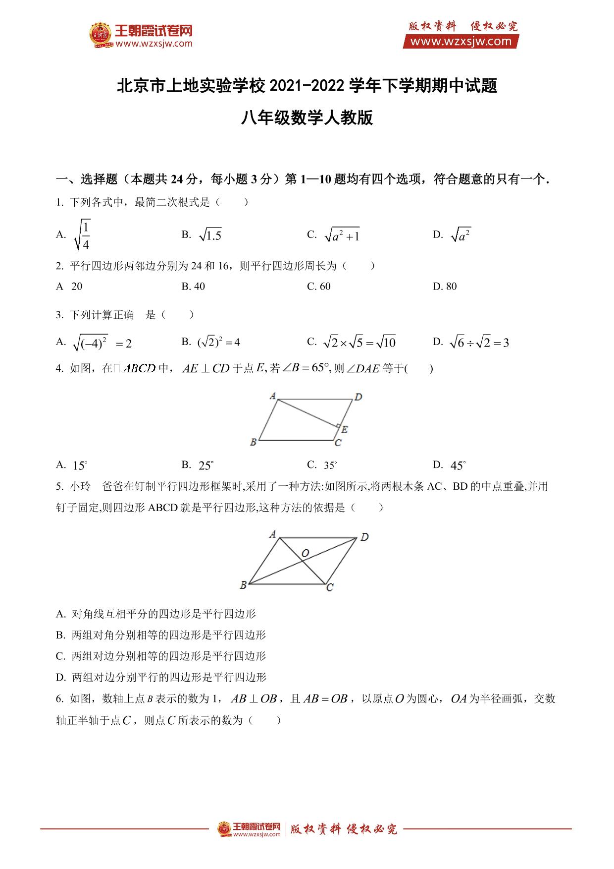 北京市上地实验学校2021-2022学年下学期期中试题八年级数学(人教版)