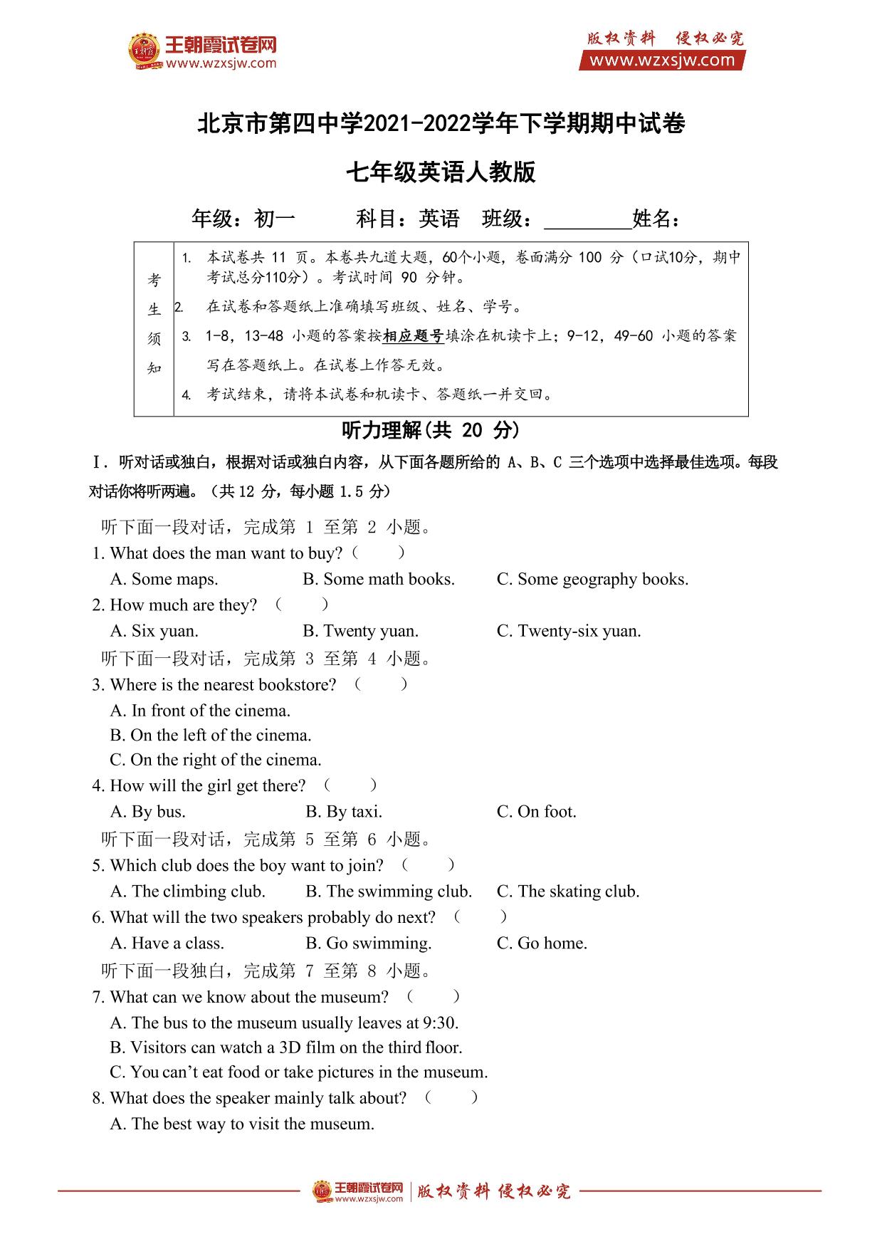 北京市第四中学2021-2022学年下学期期中试卷七年级英语(人教版)【无听力音频】