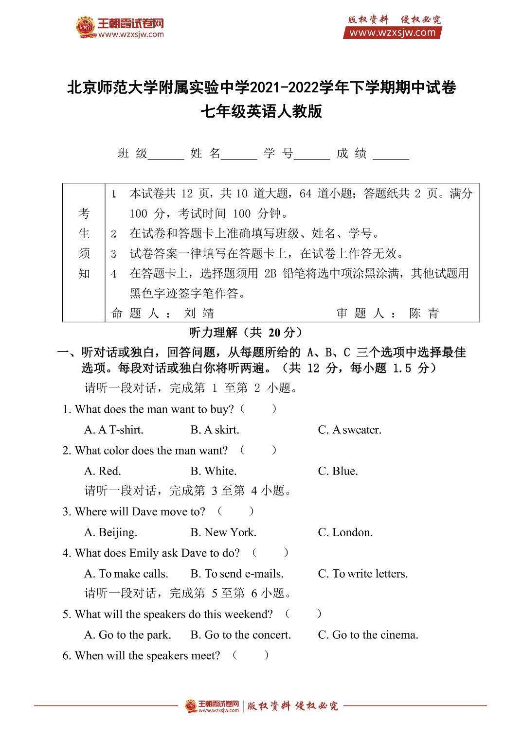 北京师范大学附属实验中学2021-2022学年下学期期中试卷七年级英语(人教版)正文 【无听力音频】