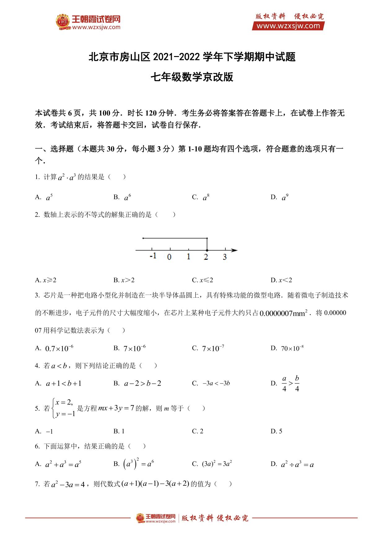 北京市房山区2021-2022学年下学期期中试题七年级数学(京改版)