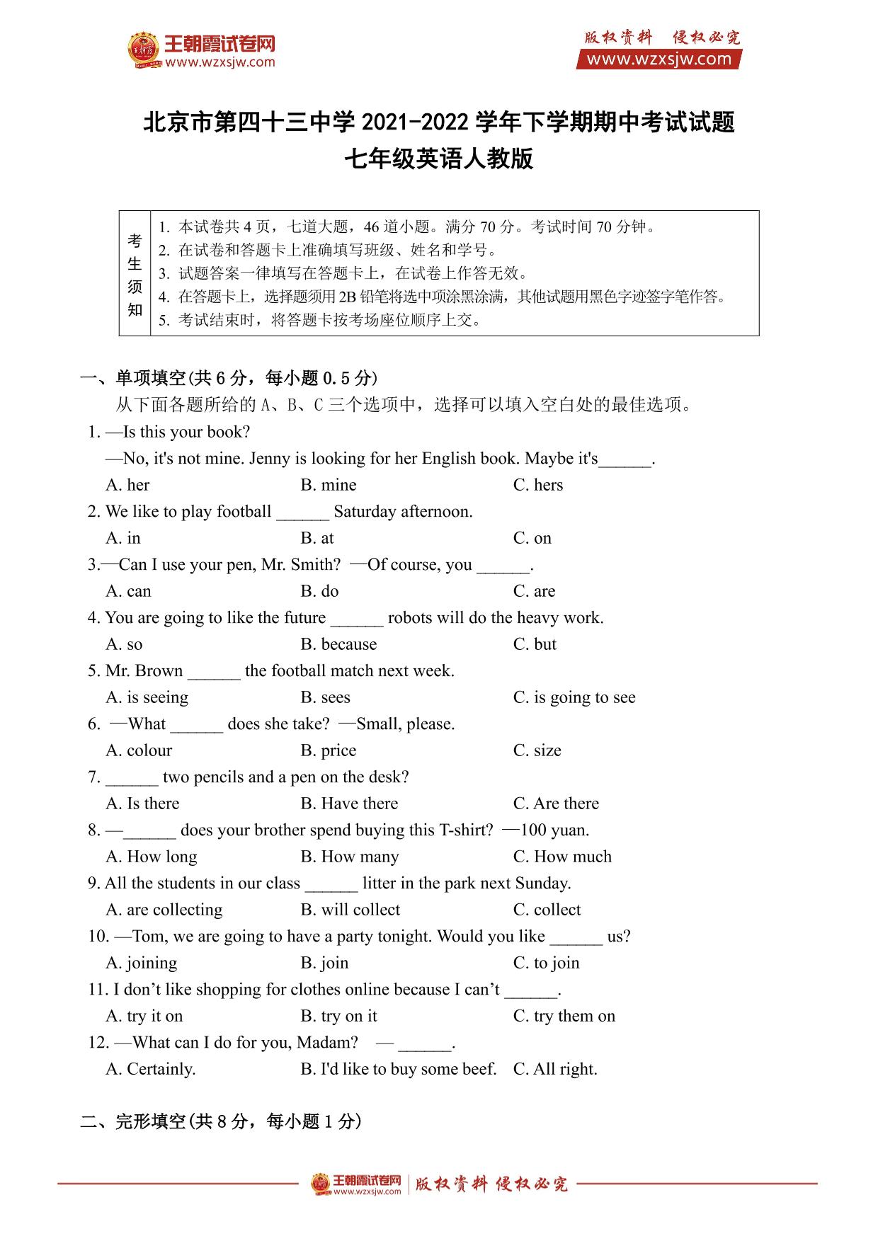北京市第四十三中学2021-2022学年下学期期中考试试题七年级英语(人教版)【无听力音频】