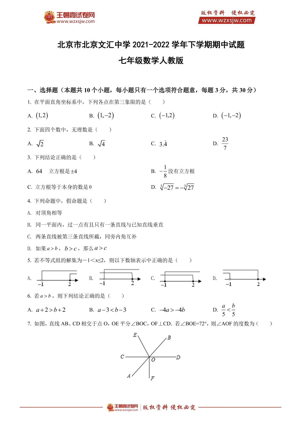 北京市北京文汇中学2021-2022学年下学期期中试题七年级数学(人教版)